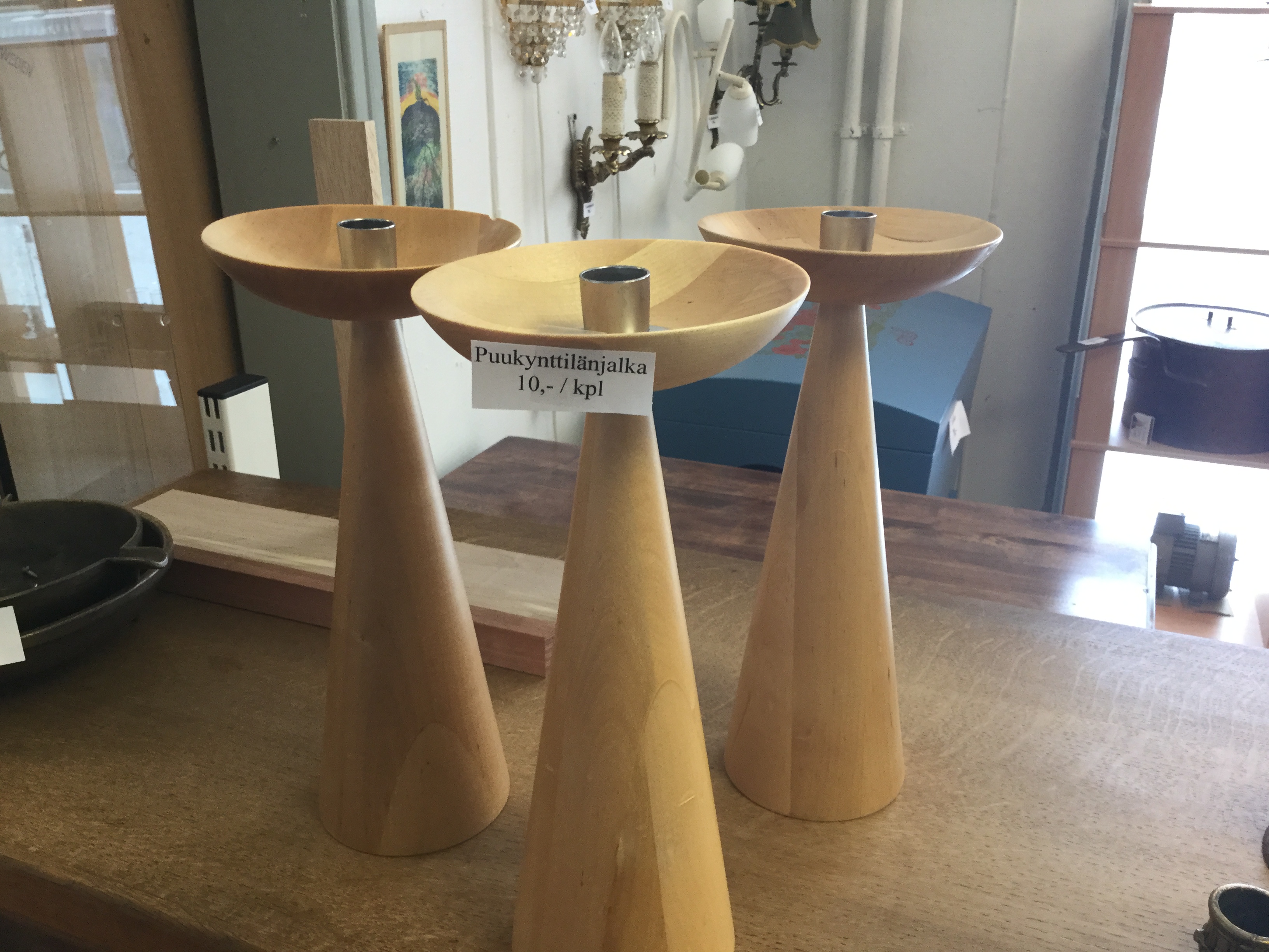 Takaisin: Kynttilänjalat Kynttilänjalka 10,- / kpl Kuvaus Kolme puista kynttilänjalkaa Korkeus 28cm Hinta 10,-/kpl